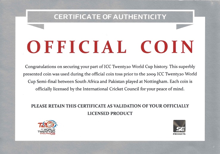 One form of cricket is Twenty20 cricket, aka Twenty-20, and abbreviated to T20. In a Twenty20 game the two teams have a single innings each, which is restricted to a maximum of 20 overs. The England and Wales Cricket Board created Twenty20 in 2002, and it has grown in popularity, spawning its own World Cup, like the ones played in 2009. I have a couple of match-used coins from the 2009 Twenty20 World Cup, including this one, from the South Africa vs. Pakistan semi-final, where Pakistan won with 149/4 over South Africa’s 142/5. The coin, slightly larger than an American quarter, is in great condition.
