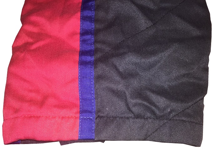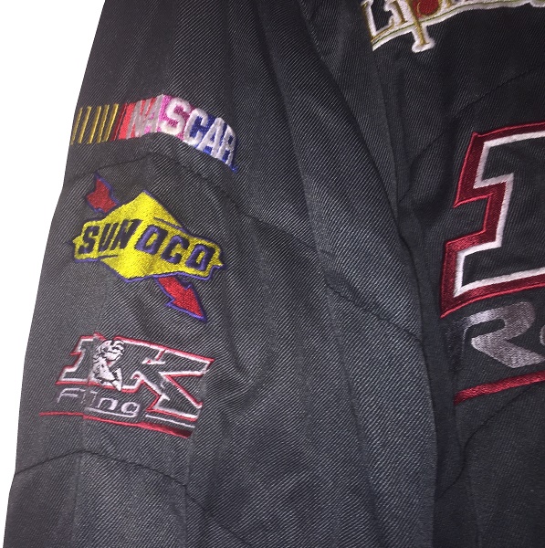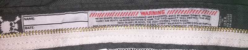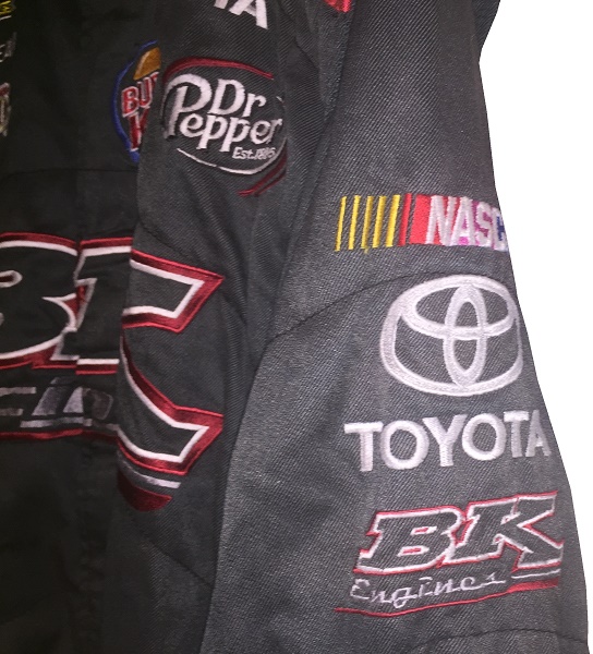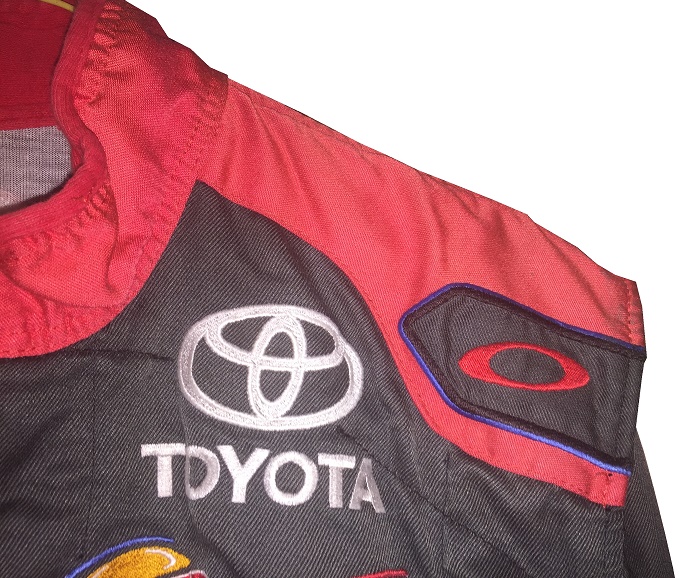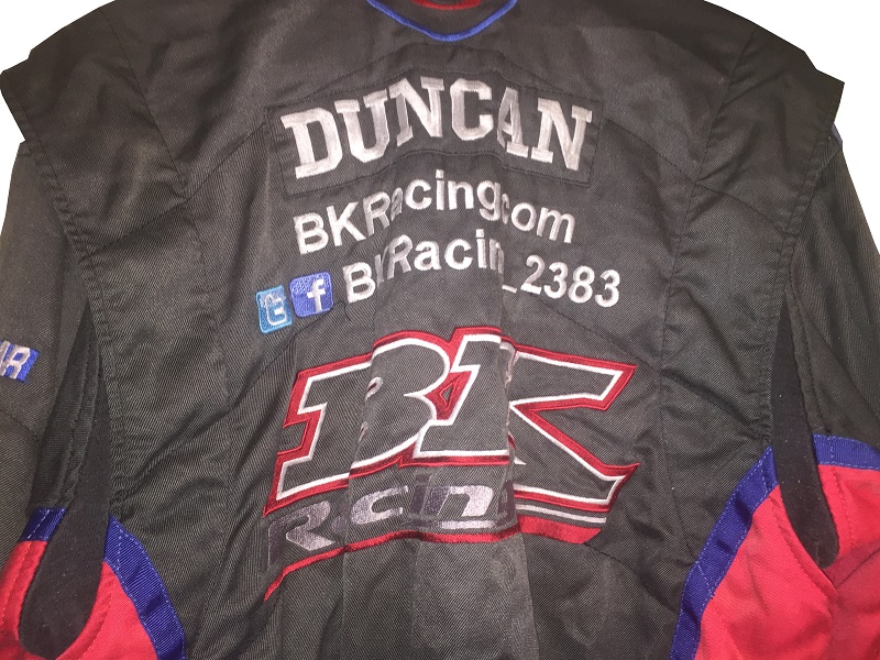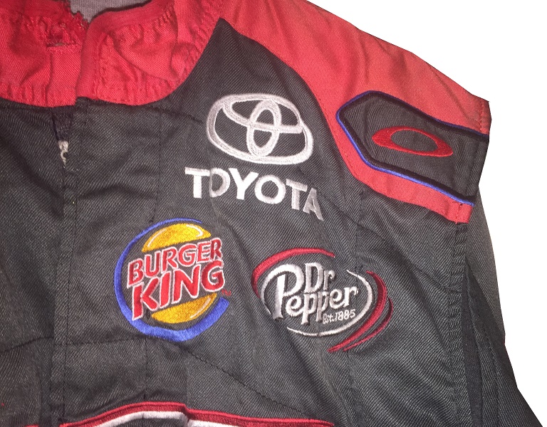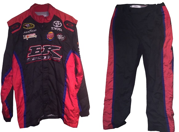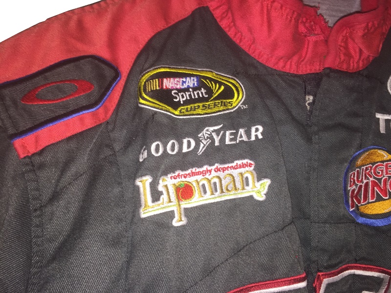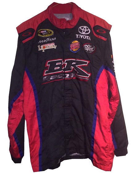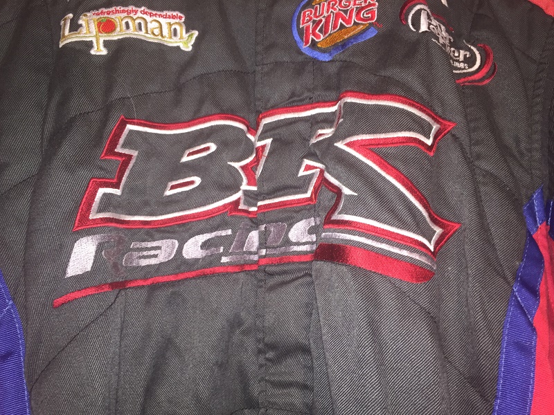 The jacket shows decent use.The standard red collar has a tear in it, and is otherwise unadorned.The cowl doesn’t have a tag of any kind.The right chest features NASCAR SPRINT CUP SERIES, GOODYEAR, and LIPMAN REFRESHINGLY DEPENDABLE logos embroidered.The left chest features TOYOTA, BURGER KING, and DR. PEPPER logos embroidered.The front torso features a large BK RACING logo embroidered.Inside the front zipper is the Oakley Warranty Label.The hems don’t have comfort straps. The shoulder epaulets have Oakley logos on the bottom, and are otherwise unadorned. The right sleeve has a NASCAR logo, a SUNOCO logo, and a BK RACING logo, and nothing in television position. The left sleeve has a NASCAR logo, a TOYOTA logo, and a BK RACING logo, and nothing in television position. The back of the jacket shows some light use.The back of the neck is unadorned, and there is an Oakley logo below the collar.The back torso features DUNCAN,BKRACING.COM,@BKRACING_2383, and a BK RACING logo embroidered.The pants show decent use, especially on the cuffs.The right leg features some wear on the red and blue stripe, and some wear on the cuff. The left leg doesn’t have as much wear as the right leg does. For some reason, even though this is an Oakley-made pair of pants, there is a team Simpson sticker on the Oakley warranty label in the back.The back of the pants don’t show much wear.The back of the waist has the SFI certification.BK Racing was another one of those teams that has raced in the Cup series for many years, and hasn’t had the success that they hoped they would. They are also one of those teams that goes out, not with a bang, but with a whimper. They are going through bankruptcy court as of this writing, and I’m willing to bet they get sold, or go under.