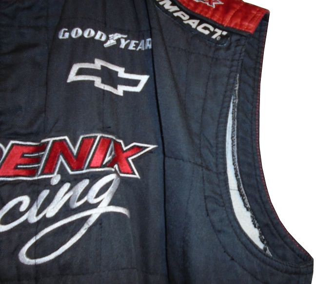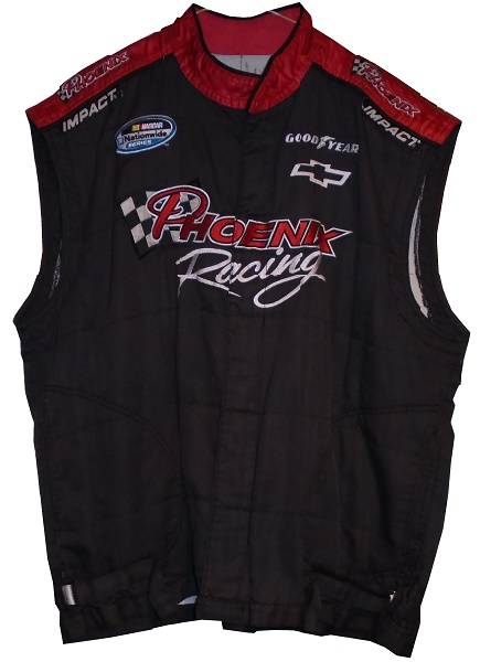 In 2011, Phoenix Racing raced in a total of 4 races, with two different drivers. Landon Cassill Started 2nd, and finished 3rd in the 2011 DRIVE4COPD 300, and Jamie McMurray raced 3 races, but failed to score a top 10. During that season, one of their crew member in the Nationwide Series wore this black Phoenix Racing vest. The vest shows light use, not surprising for a vest that was only used for 4 races at most.