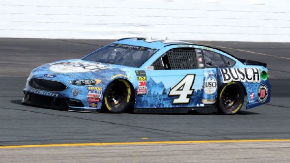 Kevin Harvick #4 Busch Plaid Ford Fusion-New scheme for 2018, dark blue plaid all over car, gold rear. A