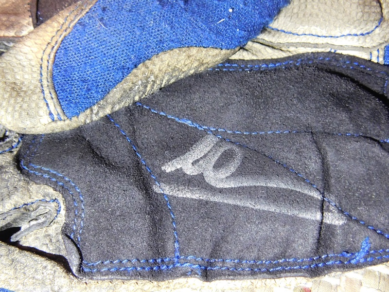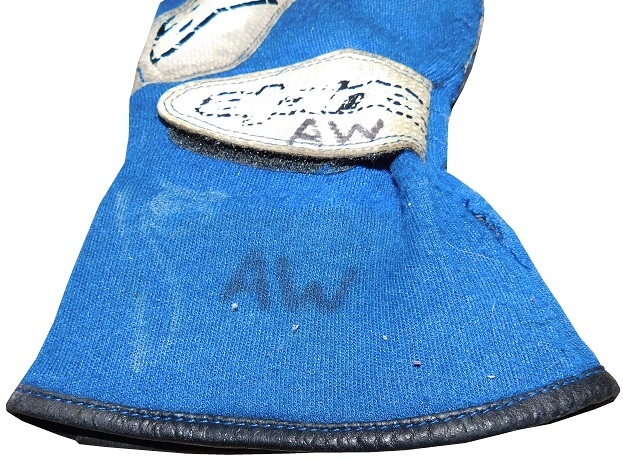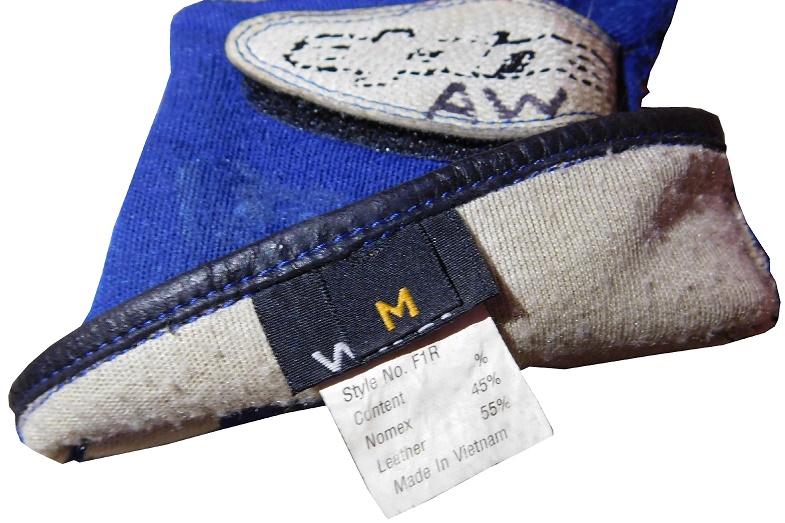 Over the years, Andy Wallace has raced in many different events, in different countries, and has worn many different uniforms, and uniform elements. One example is this Alpinestars blue right-handed glove. The glove shows heavy use, and has been autographed by Andy Wallace a staggering three times!The first signature is on the outside, on the white leather, near the Alpinestars logo. The white shows some use.A second white leather section is near the wrist, and has AW written in Sharpie. AW is also written on the blue material, and the second signature, this one in silver, is near the top of the wrist.Inside the glove on the outer side are three tags. One is a size M tag, one tag indicates: