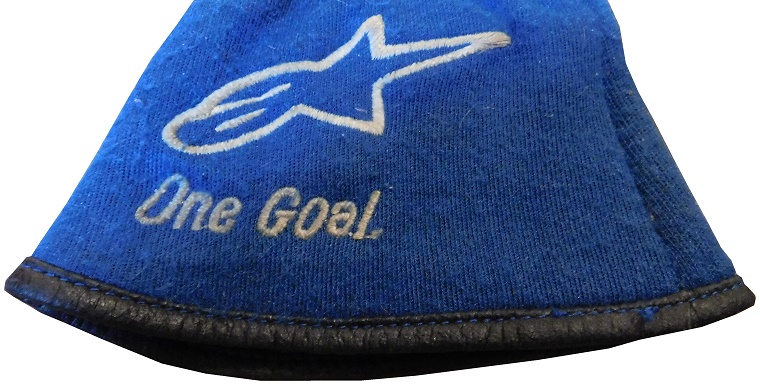The inside of the glove features heavily worn leather on the palms and fingers.The third signature is on the inside palm, in silver Sharpie.The inside of the wrist has an Alpinestars logo with ONE GOAL embroidered below it.Inside the inner wrist is the Alpinestars FIA ISO 6940 safety certification.
