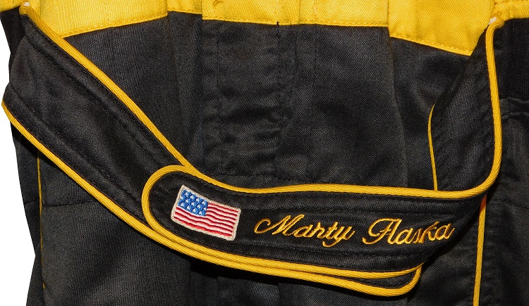MARTY FLASKA is embroidered in cursive text with an American Flag in the black belt, which is outlined in yellow.