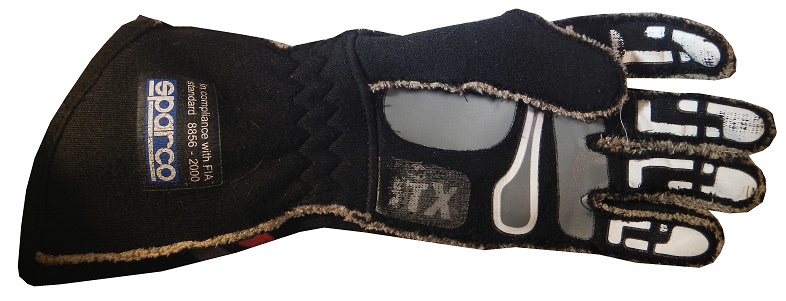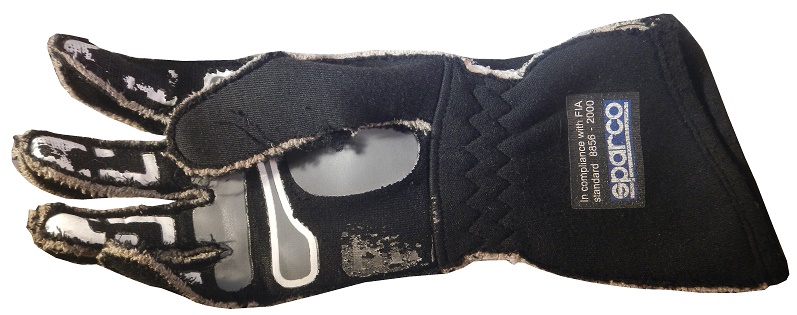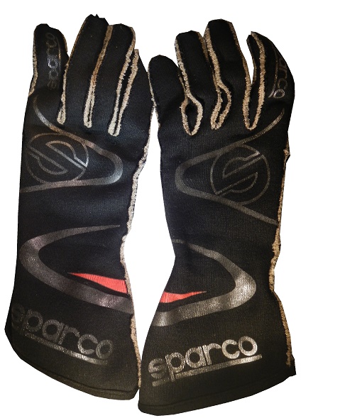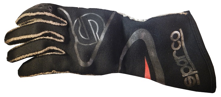 Since 2016, McAleer has worn Sparco made firesuits and equipment, including undergarments, shoes and gloves, like this black pair of gloves. The gloves show decent use.