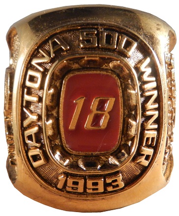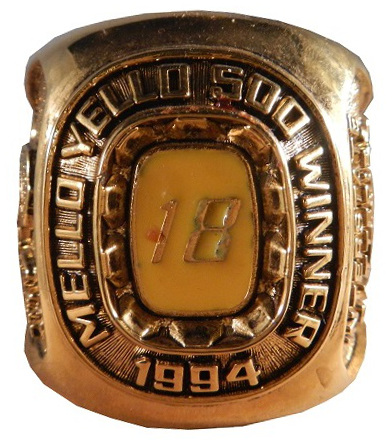 In 1994, he won his third race, the Mello Yello 500 at Charlotte Motor Speedway. He won after an engine failure claimed Geoff Bodine and a late crash destroyed the cars of Ricky Rudd and Jeff Gordon. This ring, almost identical in design to the Daytona 500 ring was prepared for the banquet. The only difference is that the #18 in the center of the top of the ring is in yellow, as the race was sponsored by Mello Yello. The small spots on the Daytona 500 ring are present here as well.