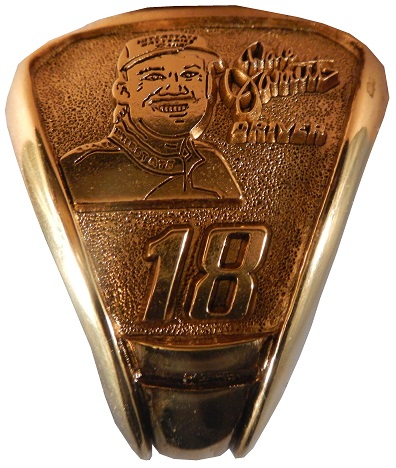 In 1993, he won the Daytona 500, the race came down to the white flag as Dale Jarrett passed Dale Earnhardt in what became known as “The Dale and Dale Show.” With his father Ned in the broadcast booth calling the race, Dale Jarrett won the race, his second career victory. His first, incidentally, came at Michigan in 1991, while driving by the Wood Brothers. This ring was made for the banquet. It shows some wear on the inside. The top is a traditional design, one side has a picture of Dale Jarrett, his signature and #18. The other side has a picture of the car sandwiched in between INTERSTATE BATTERIES RACING and JOE GIBBS RACE TEAM. The inside shows some wear in the form of spots.
