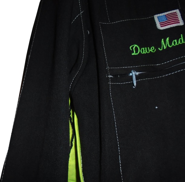 On the right chest, there is a zippered pocket. On that pocket are a couple of Simpson patches, and DAVE MADER embroidered.