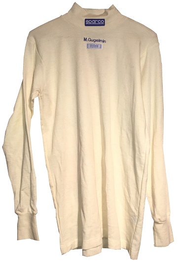 While Maurício Gugelmin wore various different suits over the years, many pictures of him feature Sparco suits. Since many drivers are loyal to suit companies, it would come as little surprise that he wore other accessories made by Sparco. This undated, customized Sparco shirt is one such example. The shirt does show some light use, though it is difficult to photograph cream-colored in Nomex.The front of the collar has a SPARCO logo embroidered.Inside the collar is a size tag that indicates that the size is Medium, as well as the Sparco warranty label.The front torso featues M. GUGELMIN embroidered, and the FIA safety certification. The torso is otherwise unadorned.The shoulders are unadorned. The long sleeve have no adornment. The back of the shirt is unadorned, and shows some light stains.The back of the neck and torso are unadorned. With that out of the way, let’s do some…