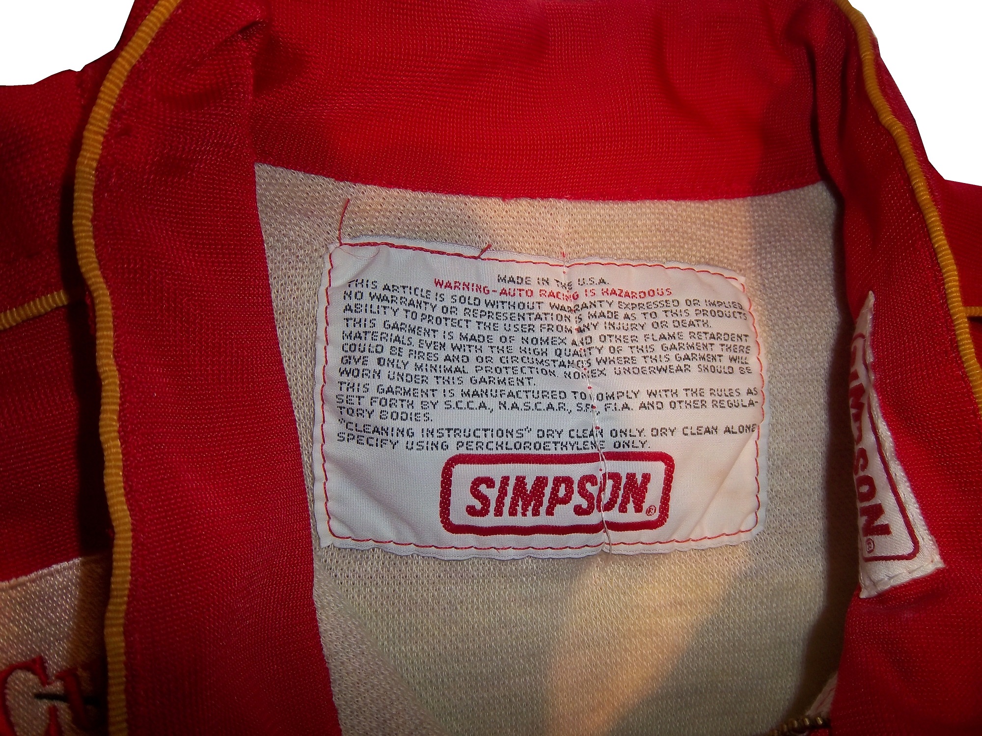 “Warning-Auto Racing is Hazardous-this Article is sold without warranty expressed or implied. No warranty or representation is made as to this product’s ability to protect the user from any injury or death. This garment is made of Nomex and other flame retardant materials. Even with the high quality of this garment there could be fires or circumstances where this garment will give only minimal protection. Nomex underwear should be worn under this garment. This garment is manufactured to comply with the rules as set forth by S.C.C.A., N.A.S.C.A.R. , S.F.I., F.I.A., and other regulatory bodies.”Cleaning Instructions” Dry clean only. Dry clean alone. Specify using perchloroethylene only.”