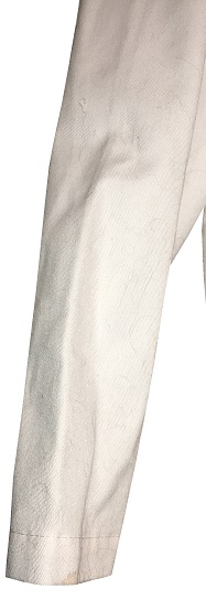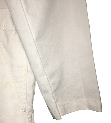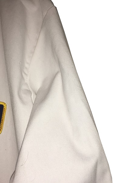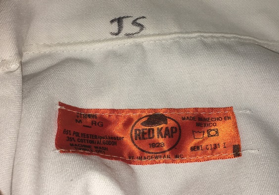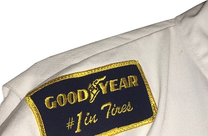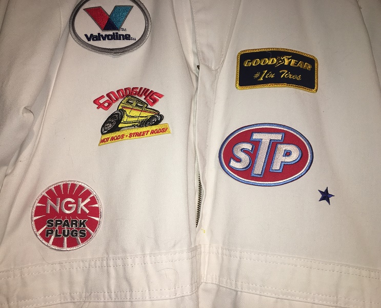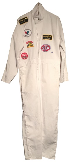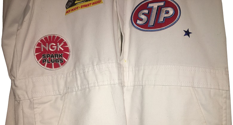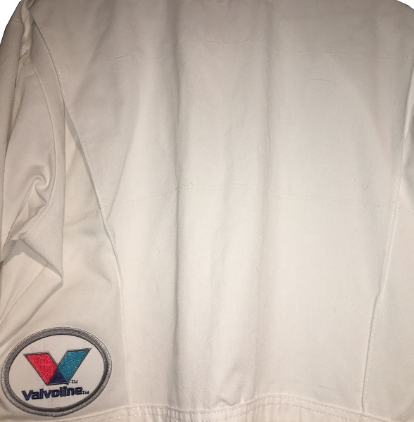 Racing has a place in pop culture. Racing has been featured in music, movies, television, and internet media. For some productions, they place a lot of effort into costume design. Lower end productions will acquire a jumpsuit, and place patches on it, as this white suit made by Red Kap. The suit doesn’t show any real wear.The collar has no adornment, and doesn’t close. It’s designed to be folded like a polo shirt.A Red Kap tag is in the cowl with JS written in Sharpie above it.The right chest features a VALVOLINE patch, a GOODGUYS HOT RODS and STREET RODS patch, and an NGK SPARK PLUGS patch sewn into it.The left chest features a GOODYEAR patch, an STP patch, and a blue star.The suit has no belt.The legs are unadorned, with no special cuffs.The suit has no epaulets, and the right shoulder has a GOODYEAR patch, identical to the one on the left chest, sewn into it.The right sleeve has an NGK SPARK PLUGS patch sewn into the upper part, and the end of the sleeve is unadorned. The suit has no epaulets, and the left shoulder is unadorned.The left sleeve is unadorned. The back of the suit is almost unadorned, with the exception of a VALVOLINE patch on the lower back.