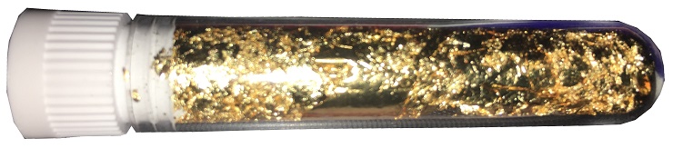 When pure gold is flattened by “goldbeating” the end result is a sheet of gold leaf. It’s main uses are for art and architecture, but it can also be edible. These are two small jars of gold leaf.