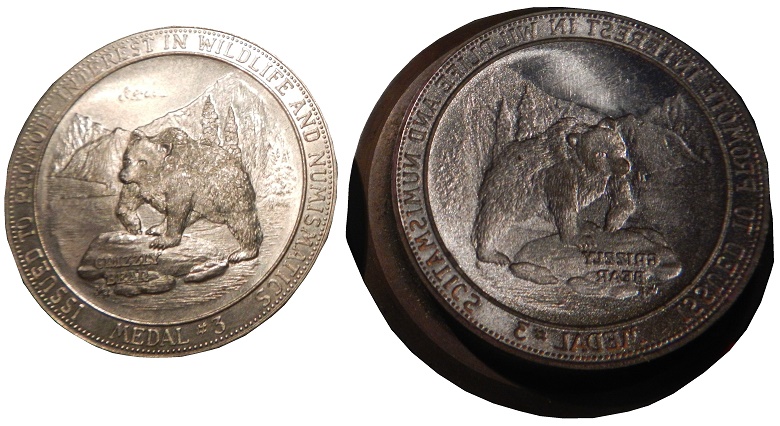 This second die is from a 1960’s Wildwood Medallic Arts Wildlife series medallion and the matching die. This is from the 3rd medal in the series, this is the Grizzly Bear die from the Grizzly Bear/Golden Eagle Medallion. The relief is just under 1.5 inches across, and is in perfect condition, having no evidence of cancellation. The medallion fits perfectly in to the die.