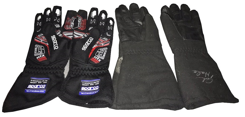 For the NASCAR side, we will look at these circa 2019 Ryan Newman race-worn gloves. They are a 5 rated pair of gloves, and are very decorated, with numerous designs and logos, since in-car cameras frequently captures images of them. The material the have is very thin.