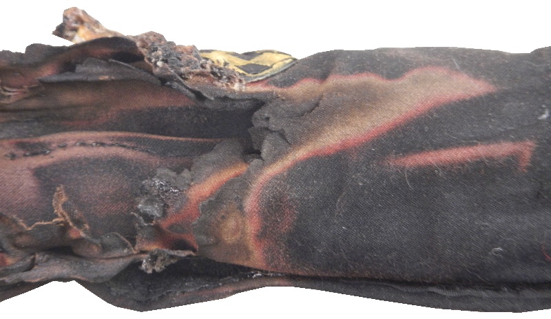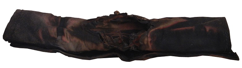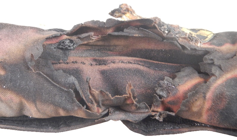 This burnt hose cover is a perfect example of why Nomex is the go-to material for driver suits. This Nomex hose cover went through a serious fire, and was burnt. Nomex isn’t fireproof, it’s fire retardant, which means it will burn, but much slower than most fabrics. It will burn, but will protect whatever it is covering from fire damage for a brief time. The easy way to see if the material has been compromised is if the fabric is discolored. Notice the areas of light on the black fabric, that means that area of the fabric has been compromised.