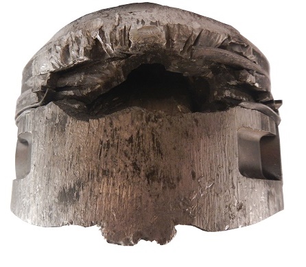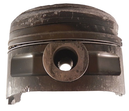 Now let’s look at an interesting Del Worsham piston from 2002. The story behind this piston is interesting. At the 2002 Checker Schuck’s Kragen Nationals at Firebird International Raceway, Del Worsham beat John Force in the final. Worsham temporarily denied Force his 100th event win. This mangled piston wrecked the engine block during that run. The piston chewed the block and itself up during that final run. Part of the piston arm is still wedged inside the piston, and one side is almost completely gone.