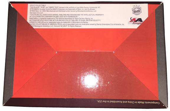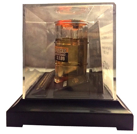 Interestingly, sometimes oil was sold to collectors, as is evidenced by this display of oil from Kyle Busch’s #18 Toyota Camry when he won the 2009 Shelby 427 at Las Vegas. The package is about 5 inches long by 3 inches wide. Inside the box is the display. It has a small oil drum with a small amount of motor oil. The oil has a thick viscosity, which is needed because of the wear that Cup engines produce during a race. The COA comes in the box, and states that this is #359 of 504.