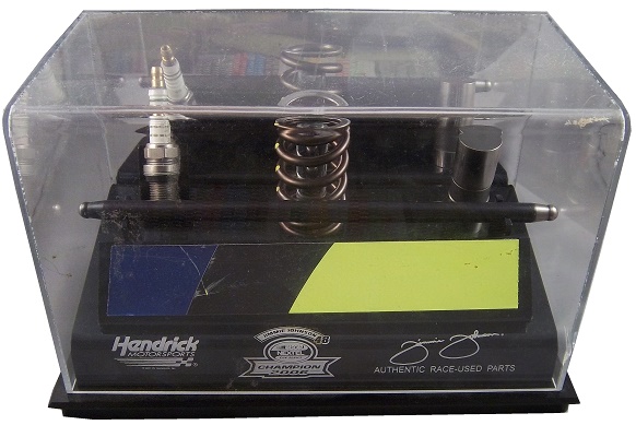 This Jimmie Johnson spark plug is part of a display which features other parts, specifically a piece of the track bar, a lifter, a valve spring, and a piece of sheet metal. Part of the plug has been modified to make the plug useless.