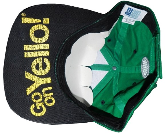 2014 saw some minor changes. It’s basically the same design, with a few differences. First, the black font on the brim has been replaced by white with black outlines. The phrase Go On Yello has been added to the under side of the bill, and the right side of the cap in the same font as 2014. Finally, the holes and squatchee have changed color from the color of the cap to black. This Shane Gray #1 Pro Stock is one example. The #1 Qualifier logo replaces the winner patch on the sides.