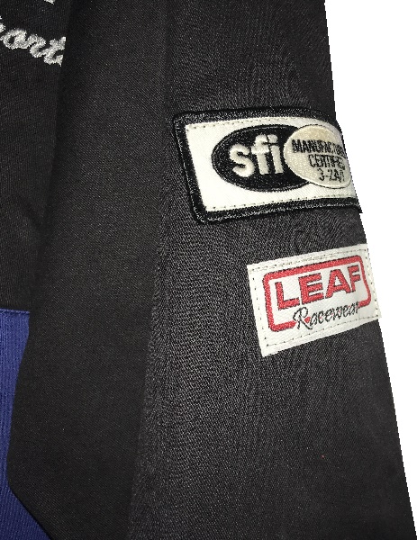 The left sleeve has an SFI 3.5A/1patch and a LEAF RACEWEAR patch sewn into it. There are no logos in television position.