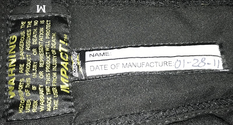 The inside of the right boot has an IMPACT warranty label, with a date of manufacture of 01-28-11.