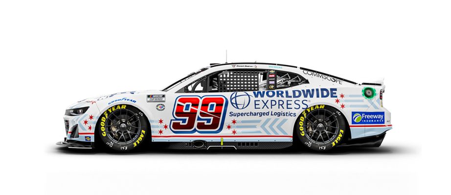 Daniel Suarez #99 Worldwide Express Patriotic Chevy Camaro-New scheme for 2023, white with Chicago/Patriotic motif. A