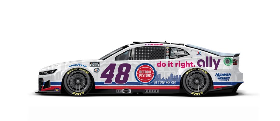 Alex Bowman #48 Ally/Detroit Pistons Chevy Camaro-New sponsor for 2023, white with red and blue stripes and sublimated city design. A
