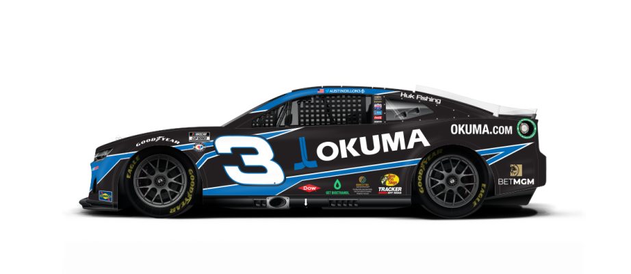 Austin Dillon #3 Okuma Chevy Camaro-New sponsor for 2023, black with blue and white designs. B+
