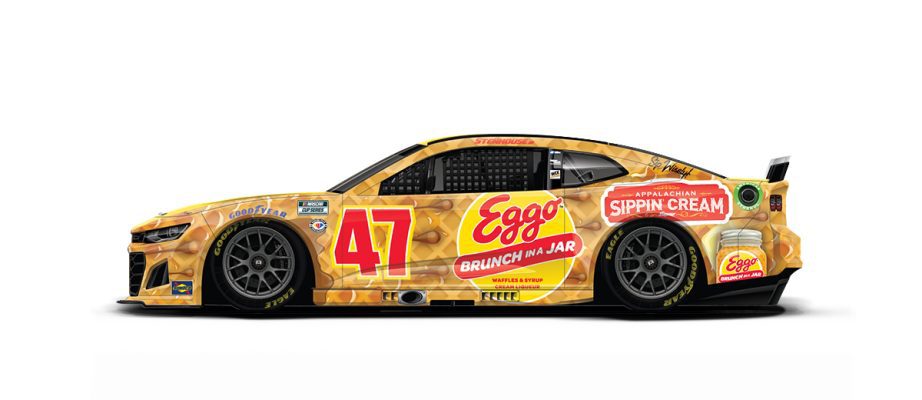 Ricky Stenhouse Jr.#47 Sugarlands Eggo Brunch in a Jar Sippin’ Cream Chevy Camaro-New sponsor for 2023, waffle motif across car. A