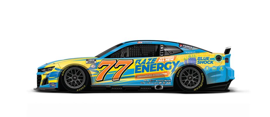 Ty Dillon #77 Raze Energy Chevy Camaro-New scheme for 2023, blue and yellow with stripes, dots, and cutting edge designs. F