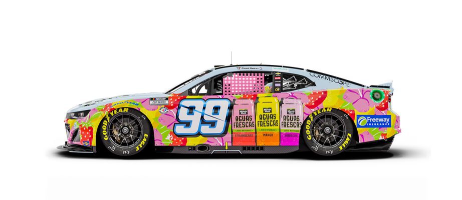 Daniel Suárez #99 Minute Maid Auguas Frescas Chevy Camaro–New sponsor for 2023, pink, purple, red, and yellow, with fruit motif. F