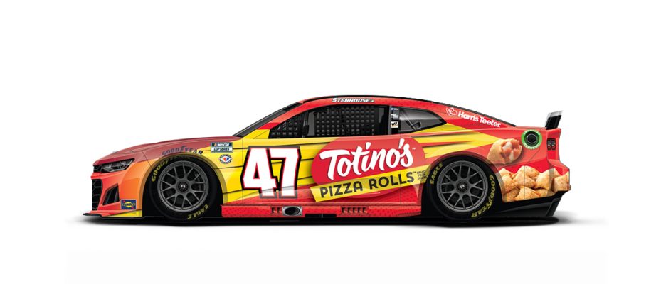 Ricky Stenhouse Jr. #47 Harris Teeter/Totino’s Chevy Camaro-New sponsor for 2023, red, orange, and yellow with stripes and pizza rolls. C