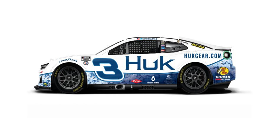 Austin Dillon #3 Huk Performance Fishing Chevy Camaro-New scheme for 2023, blue and white with sides cleaned up. A