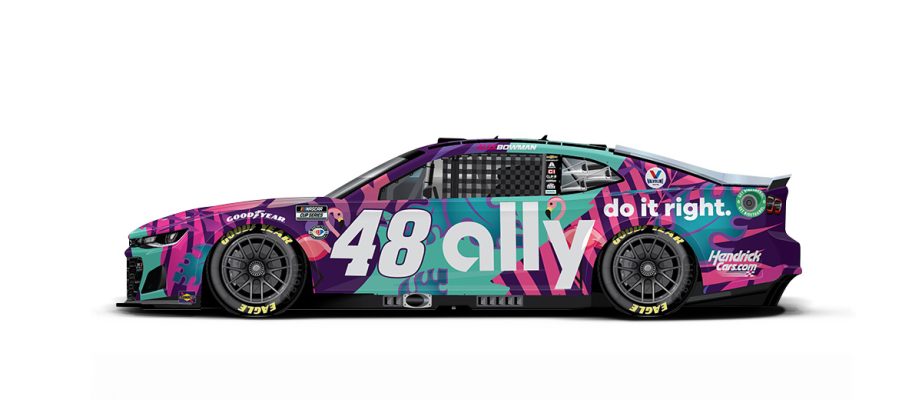 Alex Bowman #48 Ally Koker’s Garage Chevy Camaro–New scheme for 2023, pink and purple with designs. F