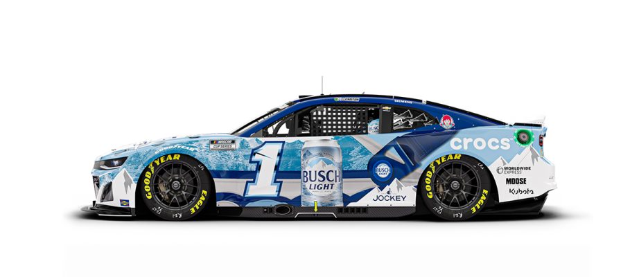 Ross Chastain #1 Busch Light Chevy Camaro–New scheme for 2024, sides cleaned up. A