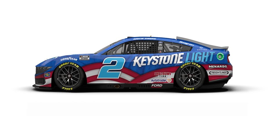 Austin Cindric #2 Keystone Light Ford Mustang–New scheme for 2024, blue with patriotic motif. B+