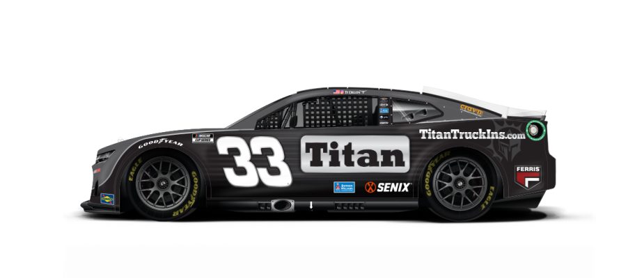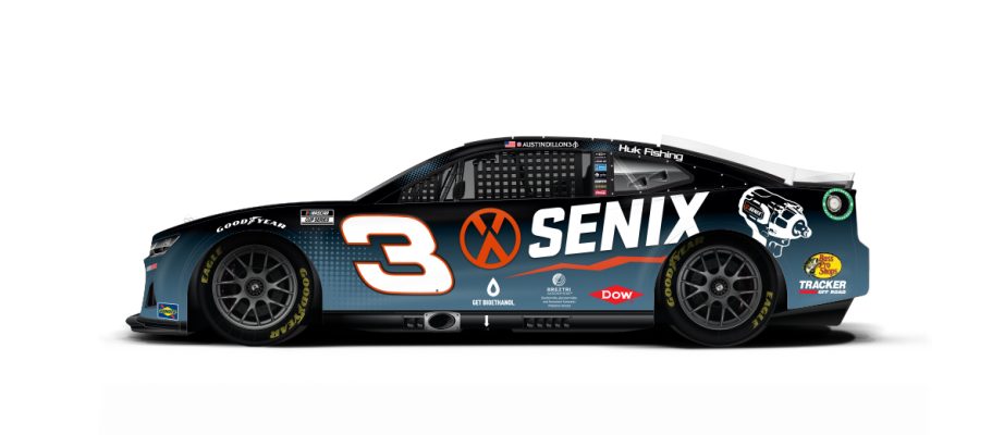 Austin Dillon #3 SENIX Chevy Camaro-New sponsor for 2024, black to gray vertical fade with designs. A