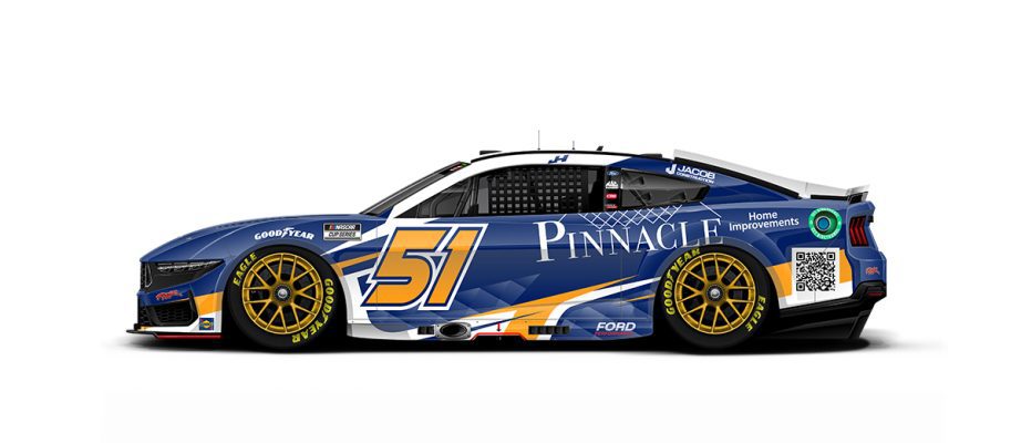 Justin Haley #51 Pinnacle Home Improvement Ford Mustang-New sponsor for 2024, light blue, dark blue, orange, and white with designs. F