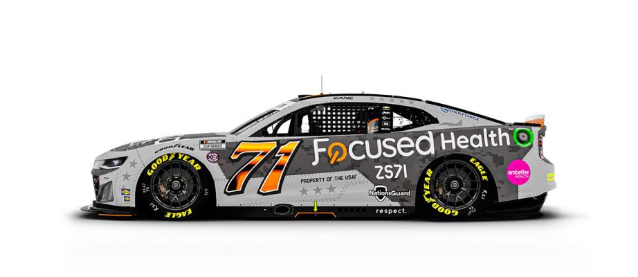 Zane Smith #71 Focused Health Patriotic Chevy Camaro-New scheme for 2024, plane metal and gray camo motif. C