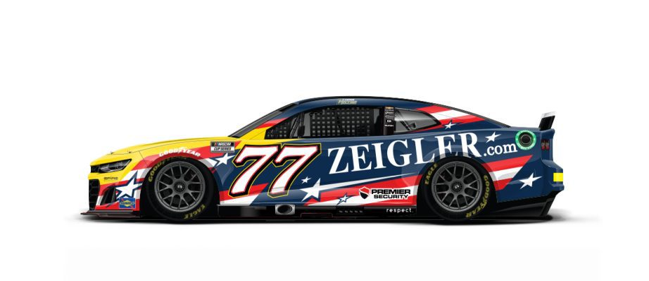 Carson Hocevar #77 Zeigler Auto Group Chevy Camaro-New scheme for 2024, yellow front with patriotic motif. C