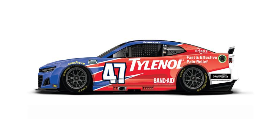 Ricky Stenhouse Jr. #47 Kroger Health/Tylenol Chevy Camaro-New sponsor for 2024, red, blue, and white with cutting edge designs. A