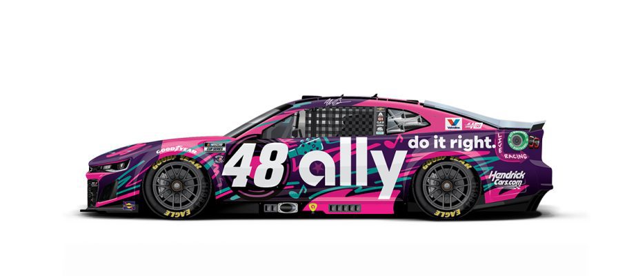Alex Bowman #48 Ally Financial Chevy Camaro–New scheme for 2024, blue, pink, and purple, with designs. F