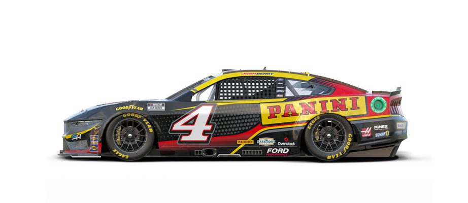 Josh Berry #4 Panini/Caitlin Clark Ford Mustang–New scheme for 2024, black, red, yellow and teal with Caitlin Clark on hood, and designs on sides. F