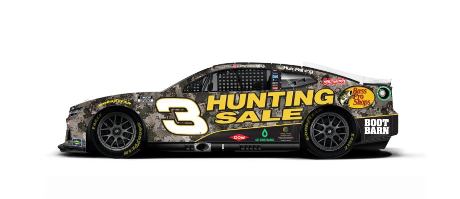 Austin Dillon #3 Bass Pro Shops Chevy Camaro-New scheme for 2024, camo with black bottom and Hunting Sale on side. F