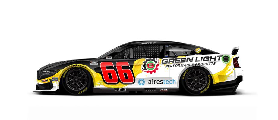 Chad Finchum #66 GreenLightPP.com Ford Mustang-New sponsor for 2024, black front, white rear, yellow fluid in between. A