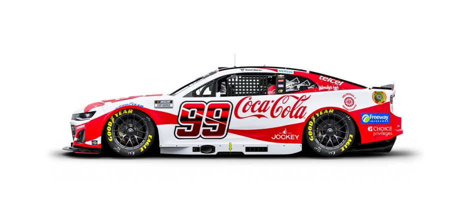Daniel Suarez #99 Wendy’s Frosty Chevy Camaro-New sponsor for 2025, white with multi-colored stripes across car. F