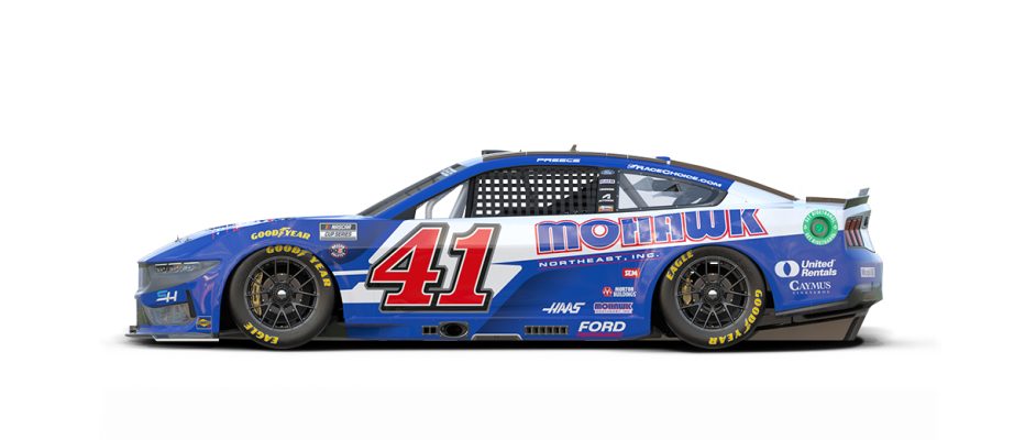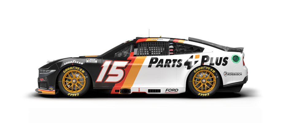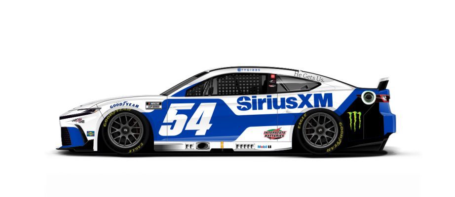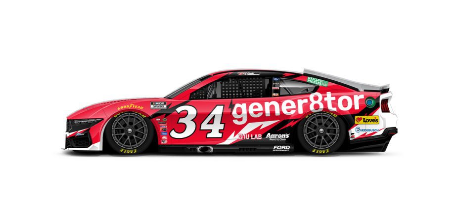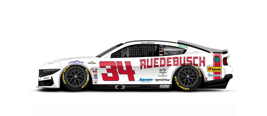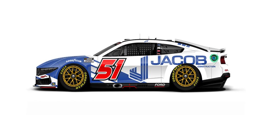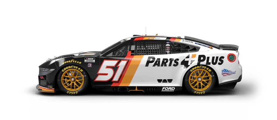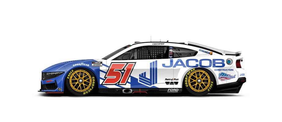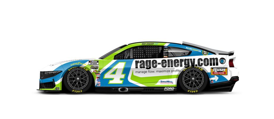 Noah Gragson #4 Rasmussen Air & Gas Energy Mustang–New scheme for 2025, white with light blue and yellow stripes. C+