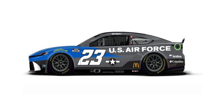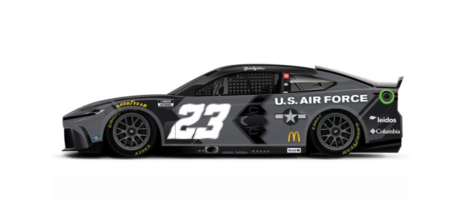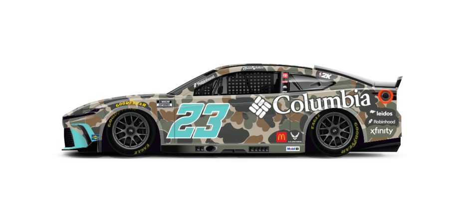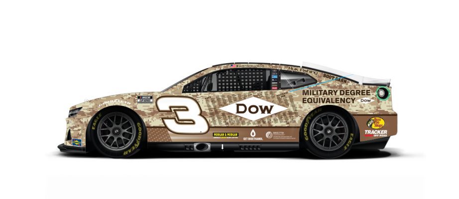 Austin Dillon #3 Dow Patriotic Chevy Camaro–New scheme for 2025, gray camo replaces green, flag design modified. F