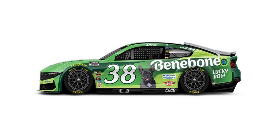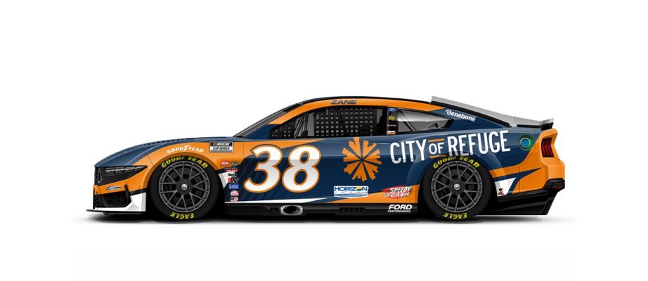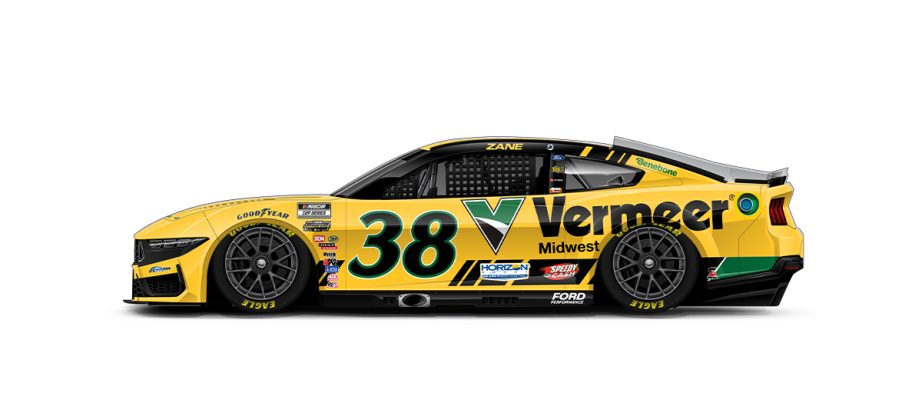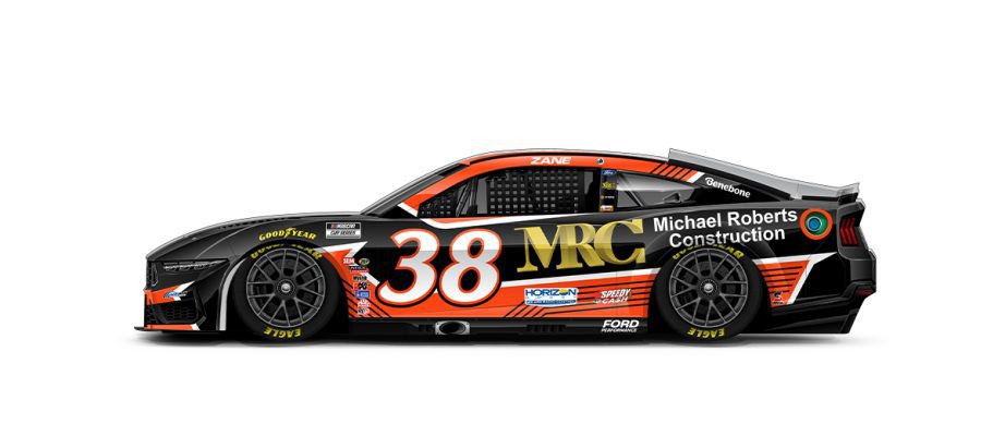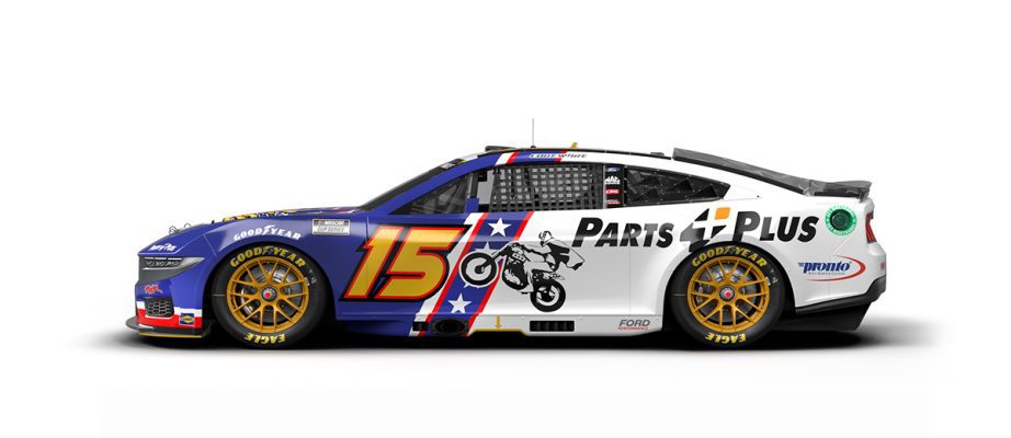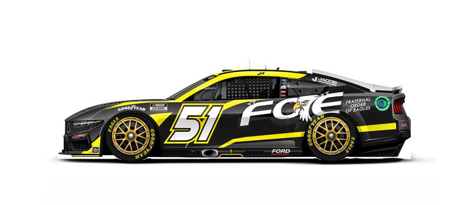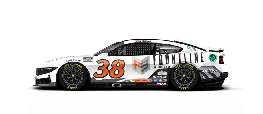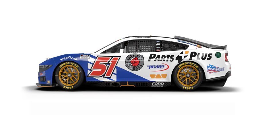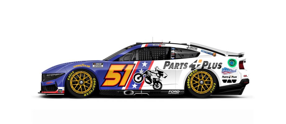 Garrett Smithley #66 Veterans Ranch Ford Mustang-New sponsor for 2025, patriotic motif across car. C