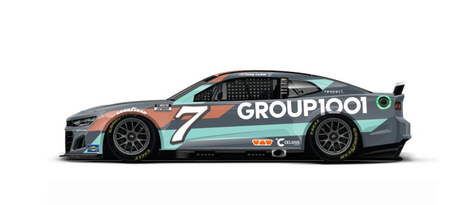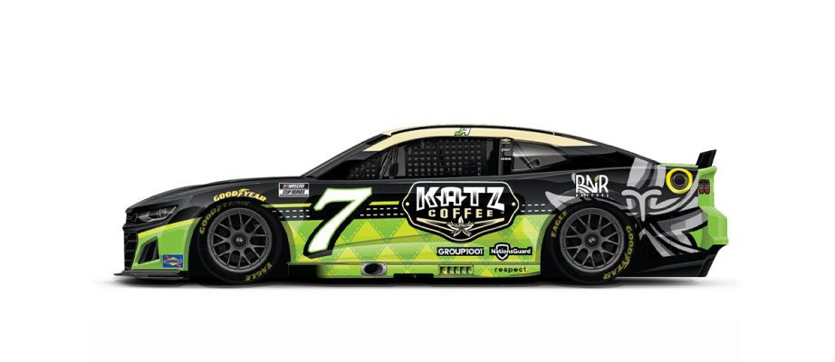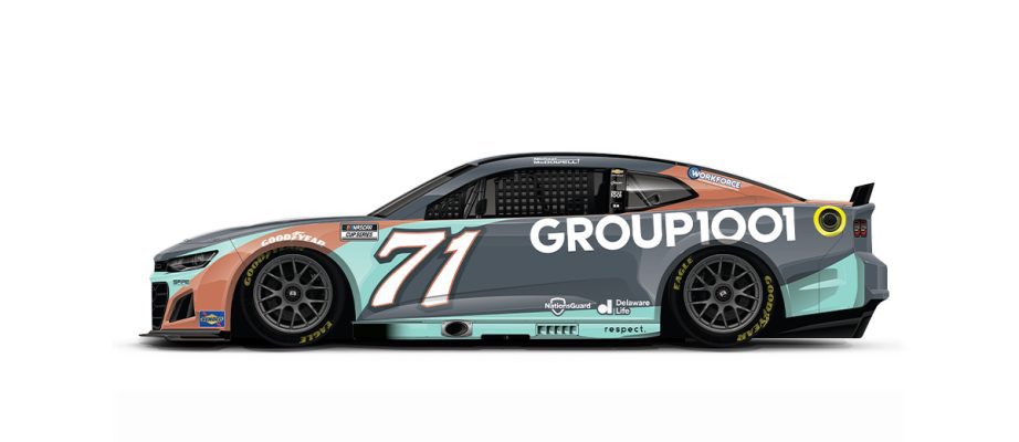 Michael McDowell #71 Group 1001 Chevy Camaro–New scheme for 2025, gray, teal and green with designs. F