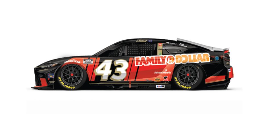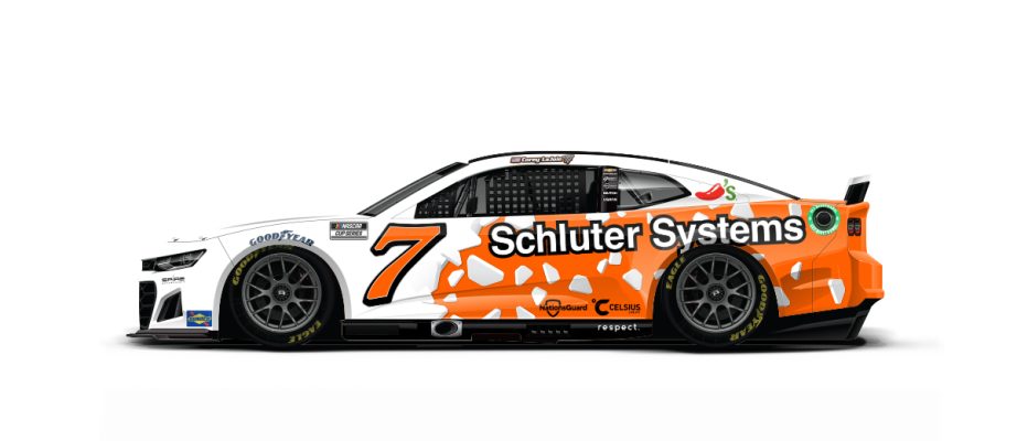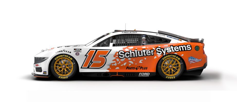 Corey LaJoie #01 Schluter Systems Ford Mustang–New scheme for 2025, black with orange shapes. A